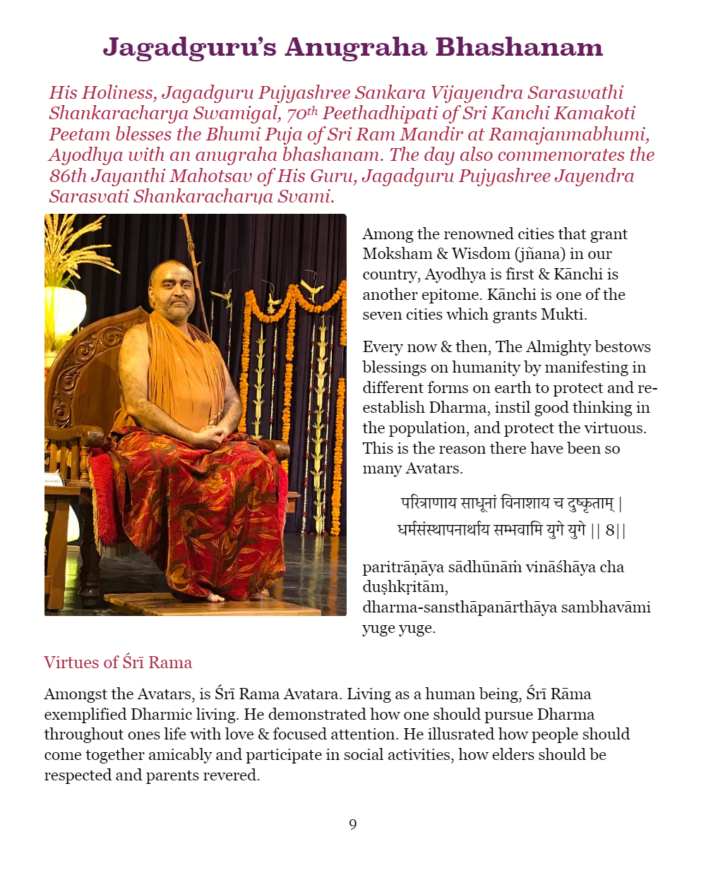 ‘Ayodhya & Kanchi – A Divine Connection ‘ – book was released by HH Pujyashri Shankara Vijayendra Saraswathi Swamiji at Ayodhya yesterday via videoconference to commemorate the Ram Janma Bhoomi Puja and the 86th Jayanti of HH Pujyashri Jayendra Saraswathi Shankaracharya Swamiji. The book was received at Ayodhya Shankara Matam by Sri Govindgiriji, Treasurer of Sri Ram Janmabhoomi Teertha Kshetra Nyas, Mahants, Sri Pankaj ji of VHP and various prominent citizens of Ayodhya. The e-version(pdf) of the book was released on the auspicious occasion of the 86th Jayanthi of HH Jagadguru Jayendra Saraswathi Shankaracharya Swamiji